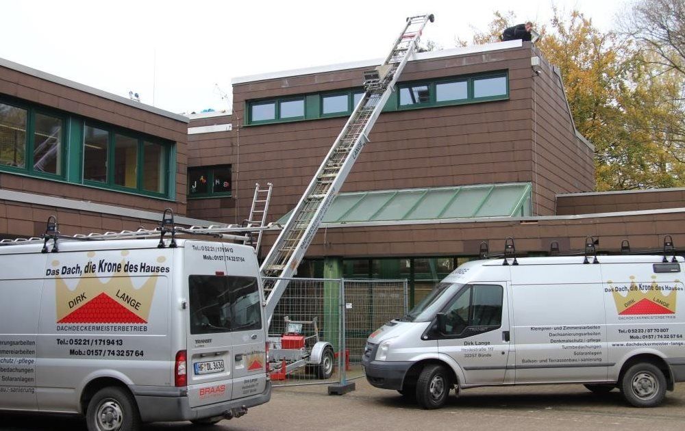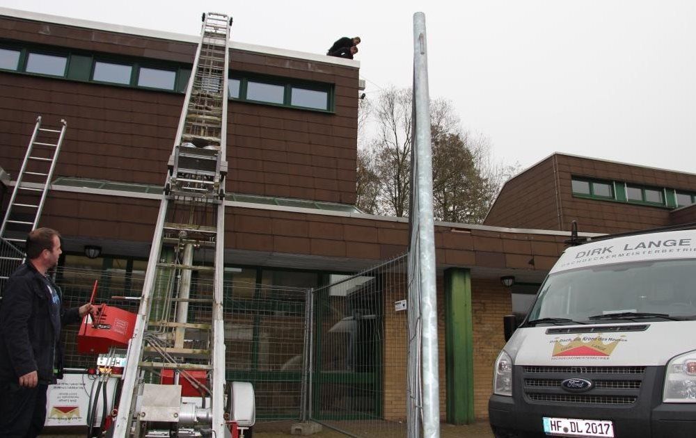 Hier sehen Sie unsere Dachdecker bei der Sanierung des Flachdaches an der Sonnenschule in Versmold: